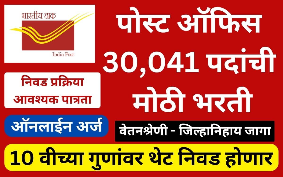 ग्रामीण डाक सेवक Gramin Dak Sevaks (GDS) अंतर्गत इयत्ता 10 वी उत्तीर्ण उमेदवारांसाठी भरतीचे अधिकृत नोटिफिकेशन इंडियन पोस्ट https://indiapostgdsonline.gov.in/ या अधिकृत वेबसाईटवर जारी करण्यात आले आहे. त्यानुसार 30,041 रिक्त पदांसाठी मोठी भरती निघाली आहे. यामध्ये थेट 10 वीच्या गुणांवर थेट निवड होणार आहे.