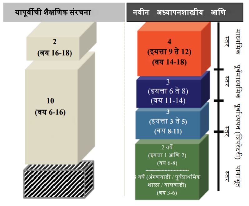 - शालेय शिक्षण ५ + ३ + ३ + ४ सूत्रांच्या अंतर्गत शिकवले जाईल.