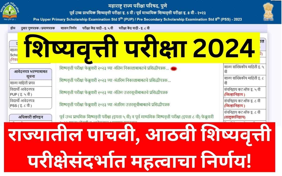 शिष्यवृत्ती परीक्षा सन 2024 साठी परीक्षा परिषदेच्या https://www.mscepuppss.in/ या संकेतस्थळावर दि. 01/07/2023 रोजी पासून शाळांना ऑनलाईन आवेदनपत्र भरण्यासाठी सुविधा उपलब्ध करून देण्यात येणार होती. मात्र काही तांत्रिक व प्रशासकीय कारणांमुळे सदर सुविधा दि. 1 जुलै 2023 ऐवजी दि. 1 सप्टेंबर 2023 रोजी पासून सुरु करण्यात येणार आहे. इ. 5 वी व इ. 8 वी मध्ये शिकणाऱ्या जास्तीत जास्त विद्यार्थ्यांना शिष्यवृत्ती (Scholarship) परीक्षेला प्रविष्ठ होण्यास प्रोत्साहित करण्याबाबत उपाययोजना करण्याबाबत कळविण्यात आले आहे.